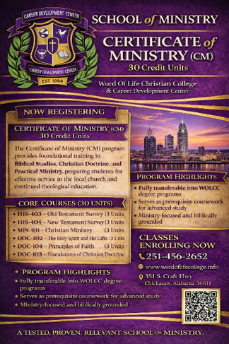 The ABS degree consists of 30 core units and 30 elective units. A minimum of 15 units must be completed through Word Of Life Christian College (WOLCC) or an approved affiliate center.